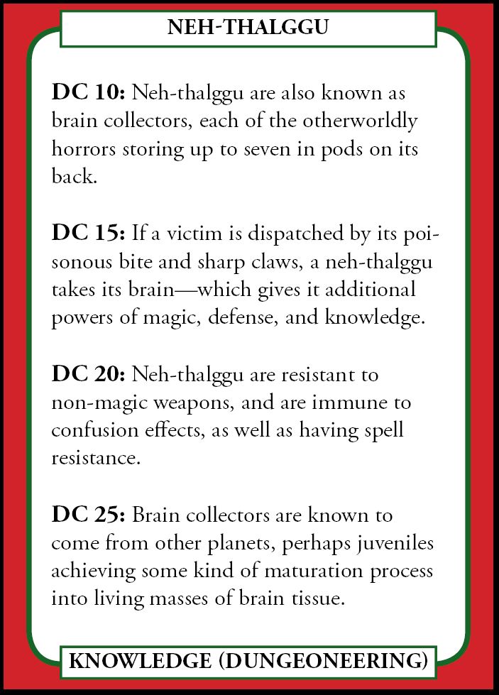 Now if you are using the traditional monster knowledge rules, and if you are have an inquisitor in your game, you probably are then just used each of these as a DC bonus to the monster's CR. So the first piece would be CR +10, the second CR +15 and so on for average monsters. For common monsters I would drop 5 off that CR and rare monsters I would add an additional 5. The cards are very useful regardless of which system you use.
