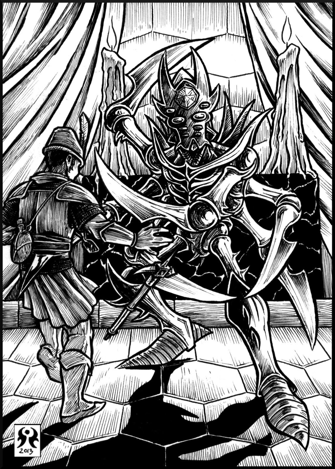 There is a place on the world of Porphyra called the Theater of Arrival, though no plays are found there. What is found there is a ring of twenty-seven stones, all an odd maroon color. The stones lie pm a field of glass, as if some great heat, light or pressure had been brought to bear on it. Though no play is performed here, there is art, of a sort. Each of the stones bears several images, three, in fact, two of which are the same on every stone, and one different. The similar images bookend the different on each stone, and appear as the engraving of a tall, thin humanoid with pointed ears, and a muscular humanoid with tusk-like fangs and fierce demeanor. It is said that if you look at the images long enough, in that wind-swept place, they start to look more and more like each other. The central image of each stone is unique. It is here that the elven runecasters and orcish runereapers triggered The Calling and irrevocably changed the face of Porphyra.